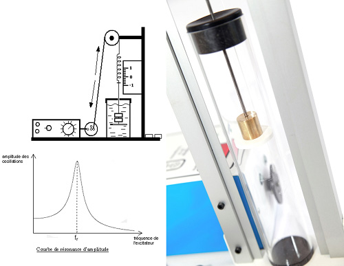 The oscillating system consists of the spring of least stiffness and of a small diameter cylindrical mass. Forced oscillations will be generated by motor rotation. Motor rotation speed and thus system oscillation frequency will be varied. Fill the graduated cruet with water and plunge the mass into it. Gradually adjust motor frequency to start system motion. Motor rotation frequency and spring oscillation frequency can thus be compared, and the resonance curve plotted.