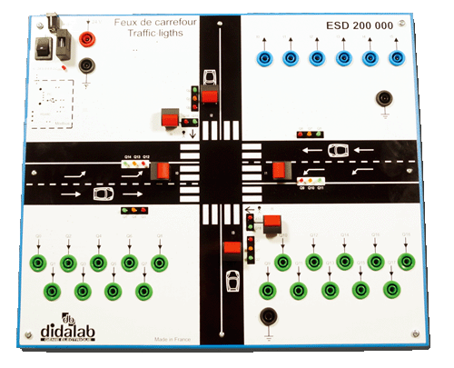 Un manuel de travaux pratiques est fourni, il comprend des TP très progressifs (du clignotement tous feux oranges au fonctionnement complet des feux avec appels piétons et détection présence voiture sur les voies secondaires et tourne à gauche sur les voies principales).