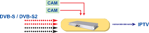 Il permet de traiter un maximum de 4 entrées satellite (2 pour chaînes en clair et 2 pour chaînes cryptées) et jusqu’à 10 IPTV streams (SPTS ou MPTS), qui peuvent être gérées à distance de façon dynamique à travers du webserver intégré.